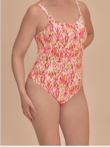 LYCRA® XTRA LIFE™ für langanhaltende Passform und Formbeständigkeit mit hoher Chlorresistenz. Ikat-inspirierter Print in Pink- und Erdtönen. Verstellbare, elastische Träger mit Ringen und Schiebern in Akzentfarbe Magenta. Material mit exzellentem UV-Schutz 50+ bietet optimalen Schutz für sensible Haut und Narben.